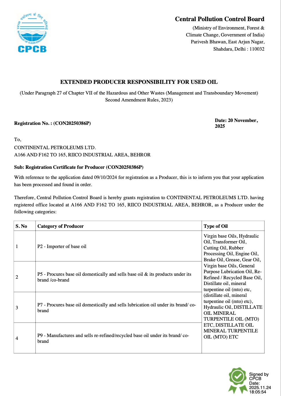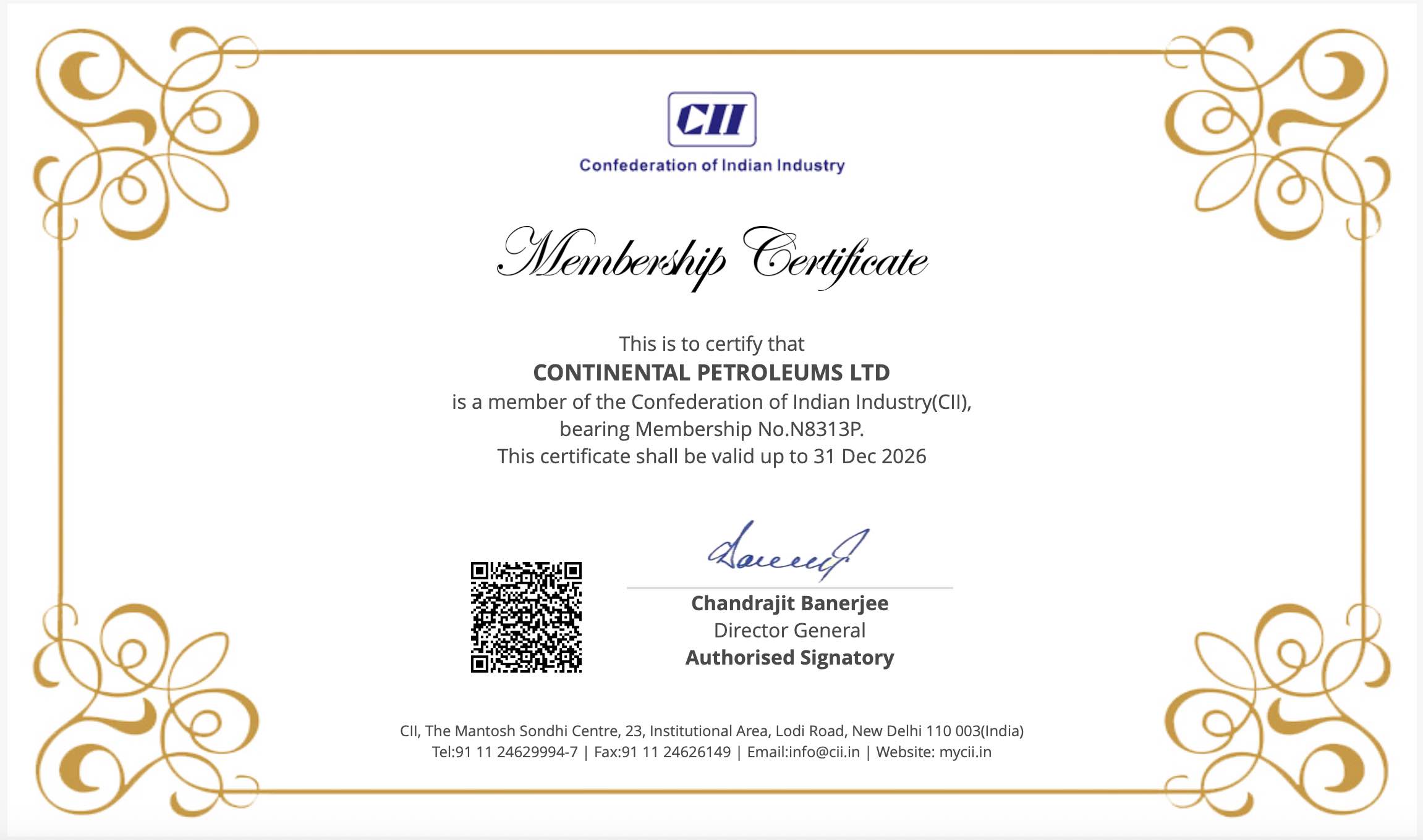 These certifications underscore Continental Petroleums Limited's commitment to quality, environmental stewardship, and occupational health and safety, ensuring that our products and operations meet the highest international standards while safeguarding the well-being of our employees and customers.